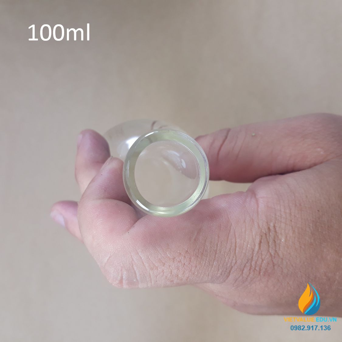 - Bình có dung tích: 100 ml, trong lượng khoảng 320 gam, thành bình dày, chụi được va đập cơ học nhẹ. Cổ bình dài, dễ dàng sử dụng kẹp đa năng 2 ngón, 3 ngón trong quá trình tiến hành thí nghiệm.