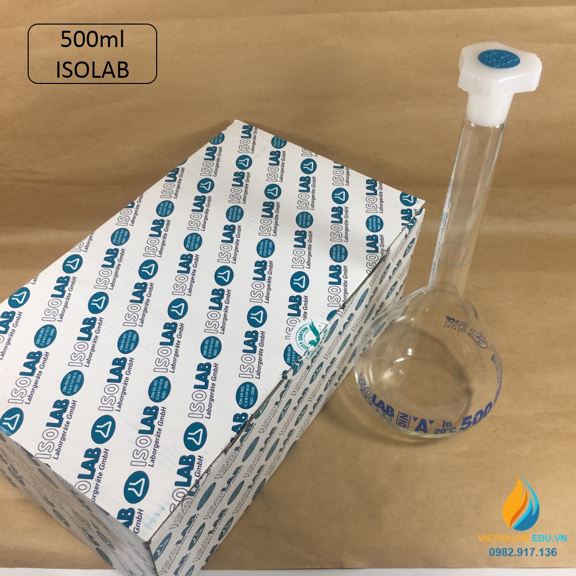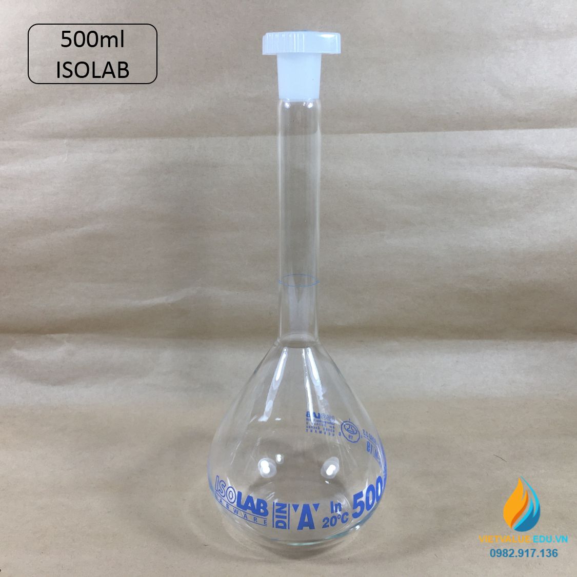 Bình định mức thủy tinh, nút nhựa, hãng IsoLab , dung tích 500ml