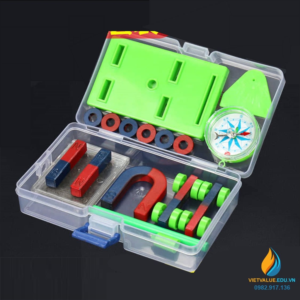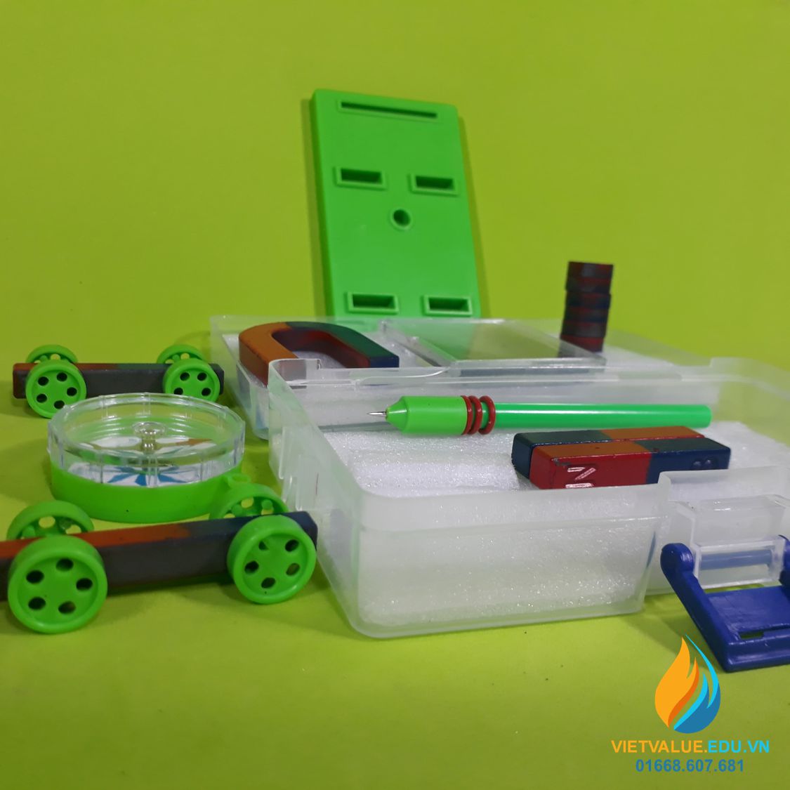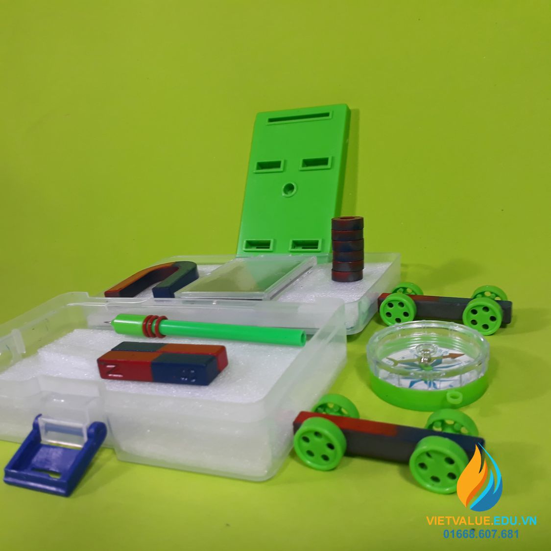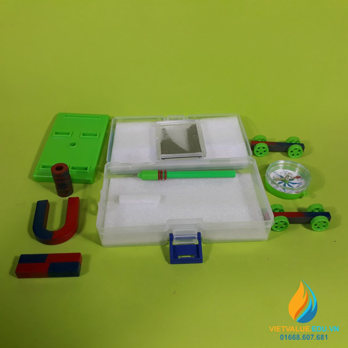 - Bộ đồ gồm 1 nam châm chữ U, 2 nam châm thẳng, 2 xe đồ chơi bằng nam châm, 1 hộp mạt sắt tạo từ phổ, 1 hộp la bàn kim nam châm, …