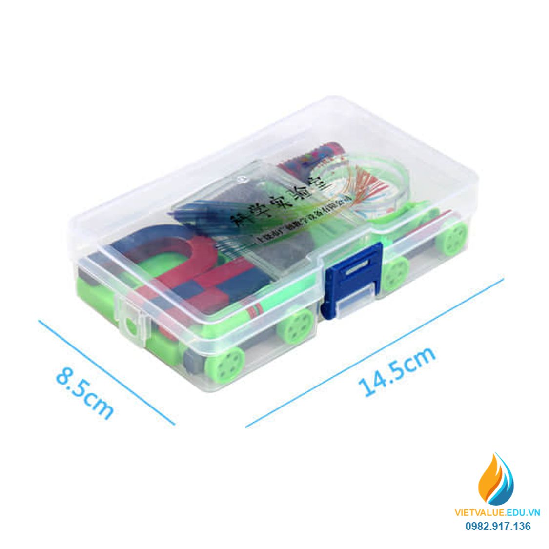 Bộ đồ dụng cụ từ tính của nam châm. Dùng để nghiên cứu từ tính cuả nam nâm thẳng, nam châm móng ngựa, tạo ra từ phổ của các loại nam châm. Nghiên cứu tương tác, từ phổ và đường sức từ của nam châm.