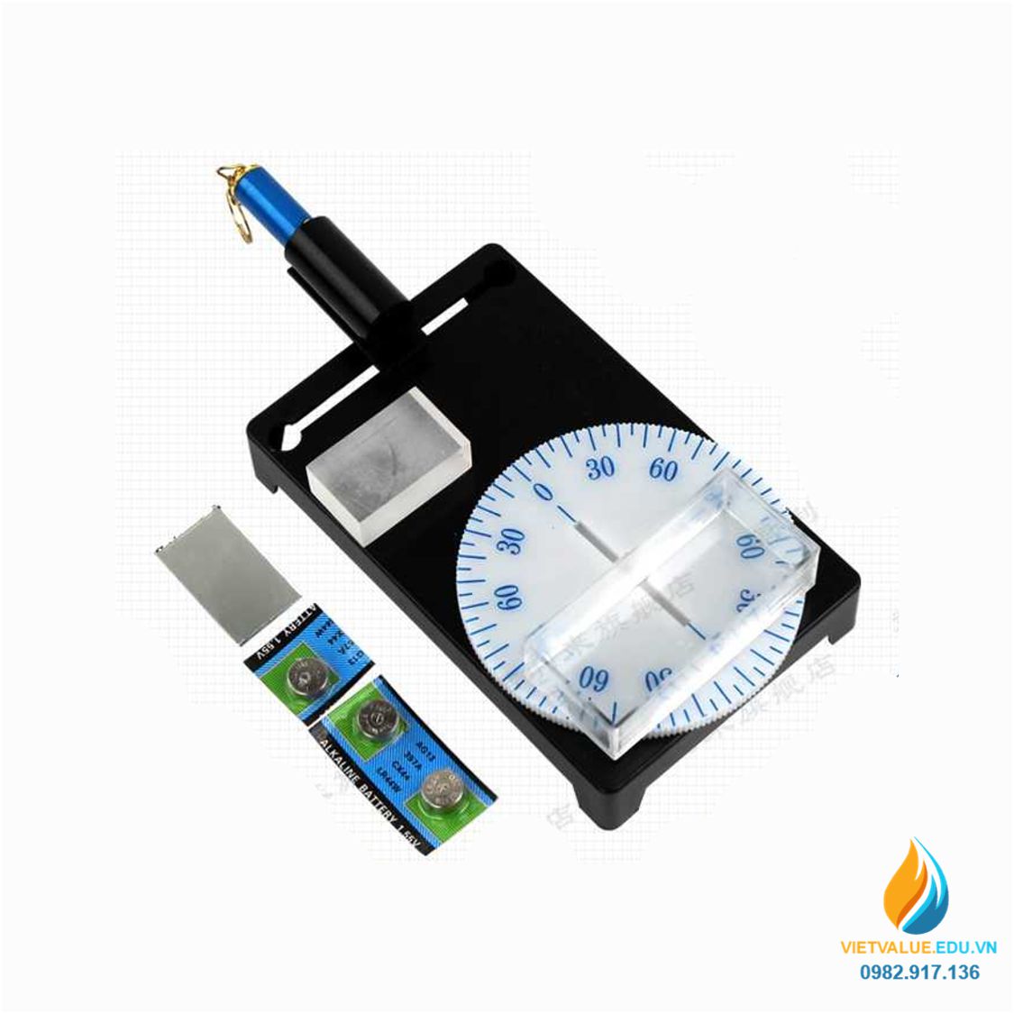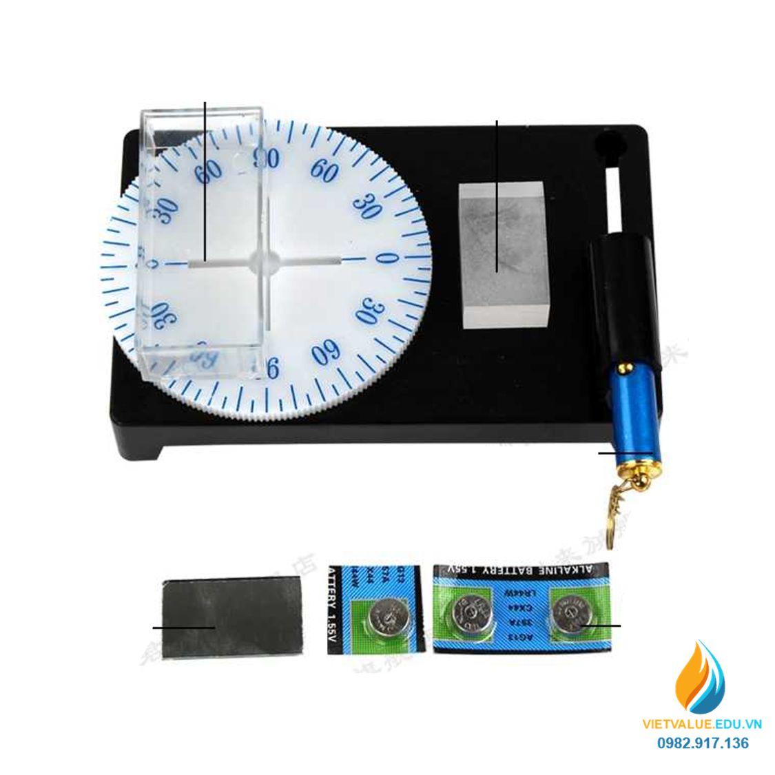 - Bộ sản phẩm bao gồm đế đỡ trên đó có gắn một nguồn sáng lazer, và một bản đo góc chia độ từ 0 đến 360 độ, có thể đo góc của tia sáng truyền qua, từ đó xác định được góc tới và góc khúc xạ.