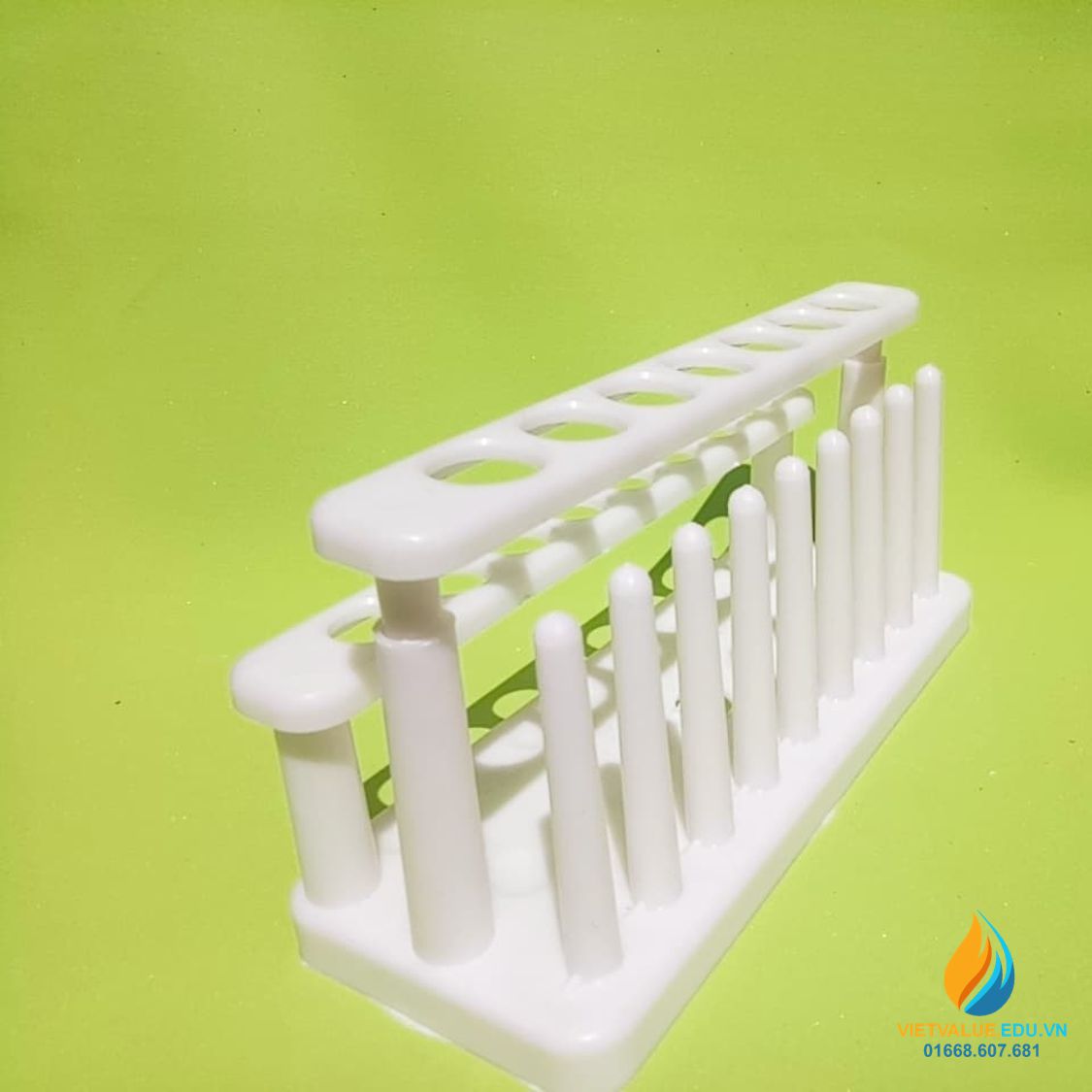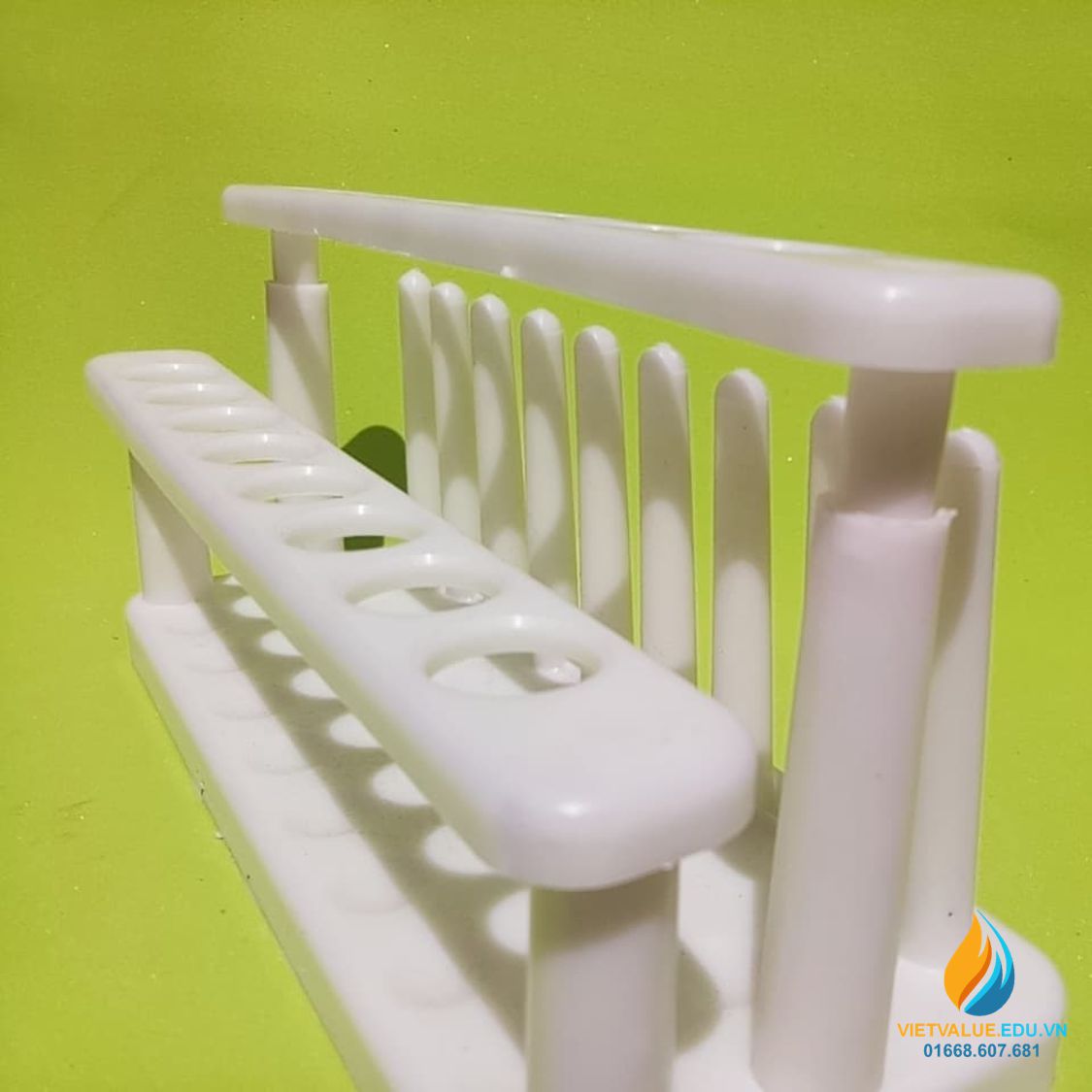 Giá đỡ ống nghiệm được làm bằng chất liệu nhựa PP cứng, màu cổ trắng, gồm 16 lỗ cắm ống nghiệm và 8 que cắm ống nghiệm, đường kính mỗi lỗ khoảng 21 mm. Dễ lau chùi khi sử dụng