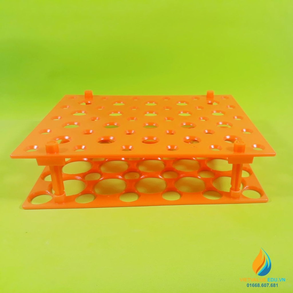 Giá đựng ống nghiệm, ống li tâm 50 lỗ, lỗ nhiều đường kính 1,5cm - 3,5cm. Dùng để đựng ống li tâm, đầu đạn chứa mẫu chất, đầu côn pipet hút, ống nghiệm thủy tinh, trong quá trình li tâm mẫu chất, thực hành thí nghiệm hóa học, vật lý.