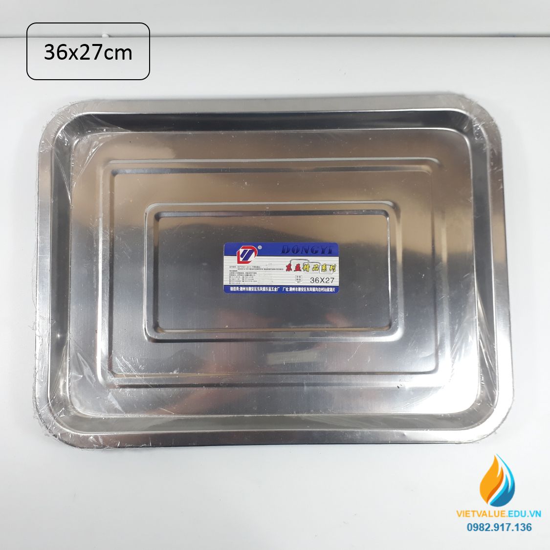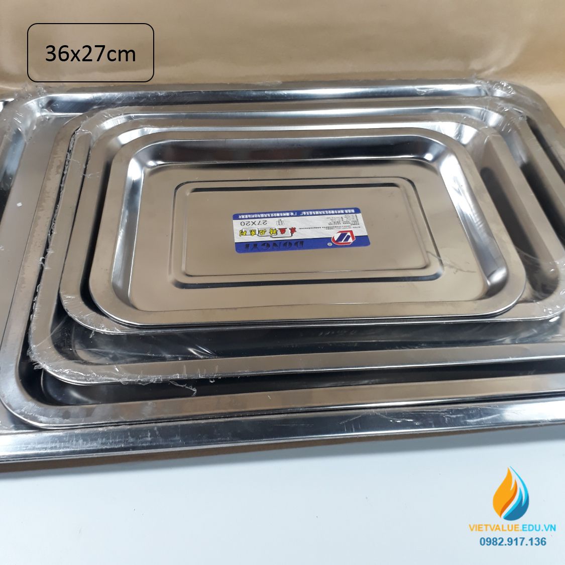 - Khay inox được làm từ inox 201 có kích thước 36cm*27cm*2cm. Inox không gỉ theo thơi gian, có độ sáng bóng, bền màu, độ dày tốt, đảm bảo an toàn khi sử dụng.
