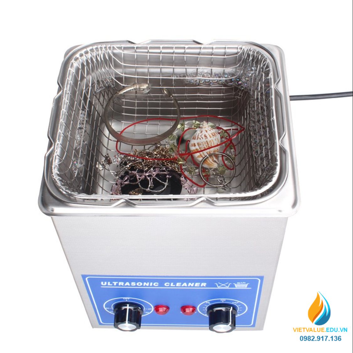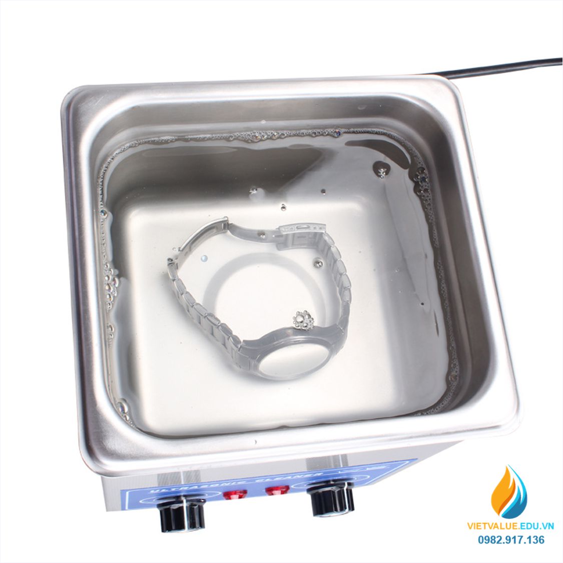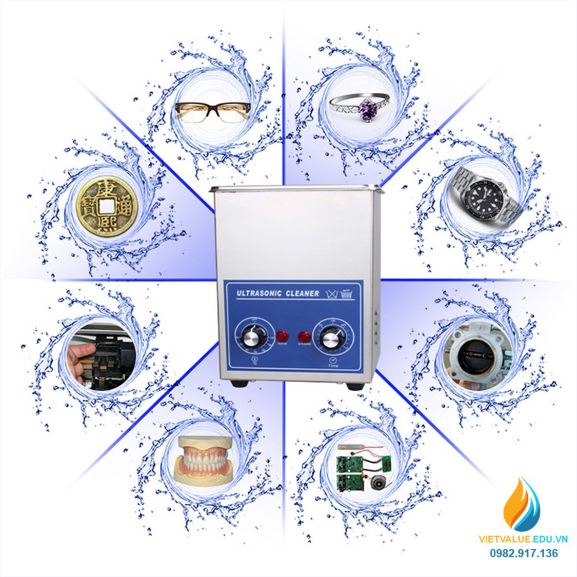 - Máy rửa bằng sóng siêu âm này được sử dụng với các vật cụ như đồ trang sức, nhẫn cưới, dây chuyền, đồng hồ, các vi mạch điện tử, kính đeo mắt, … Tất cả các sản phẩm có kích thước nhỏ không thể lau chùi dễ dàng theo cách thông thường bạn hoàn toàn có thể sử dụng máy này. Chú ý các vật cụ cần đảm bảo đưa vào nước mà không ảnh hửng đến vật cụ.