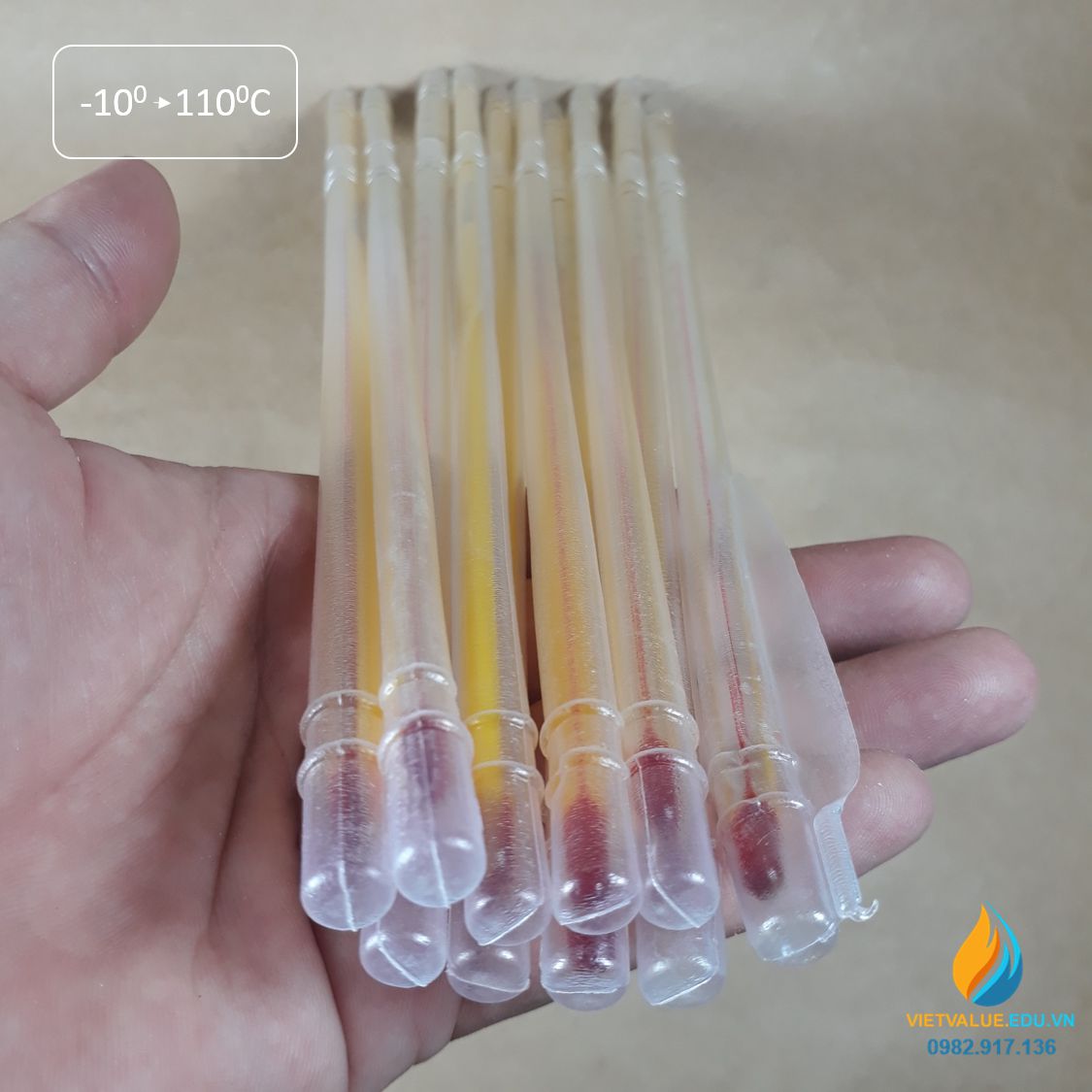 - Bạn có thể lựa chọn các loại nhiệt kế có khoảng đo âm để sử dụng với mục đích của mình. Nhiệt kế cồn từ - 30 đến 100 độ C, nhiệt kế cồn từ - 10 đến 110 độ C. Tất cả các loại nhiệt kế do VIETVALUE cung cấp có độ chính xác cao, bạn có thể yên tâm sử dụng để xác định nhiệt độ của môi trường với khoảng sai số cho phép.