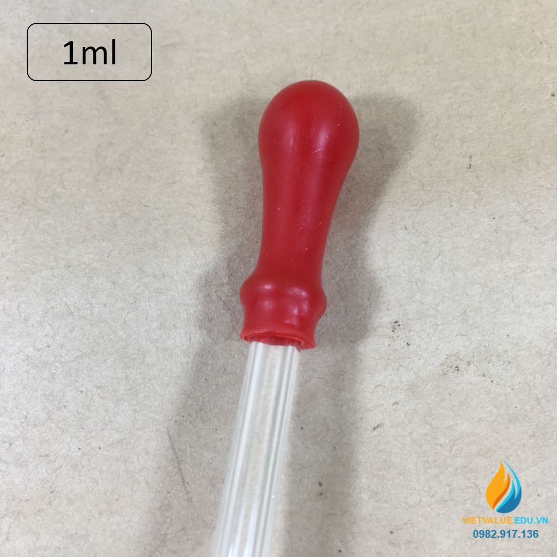 Ống hút thủy tinh vạch chia, bầu cao su đỏ, dung tích hút 0,5ml, dài 20cm