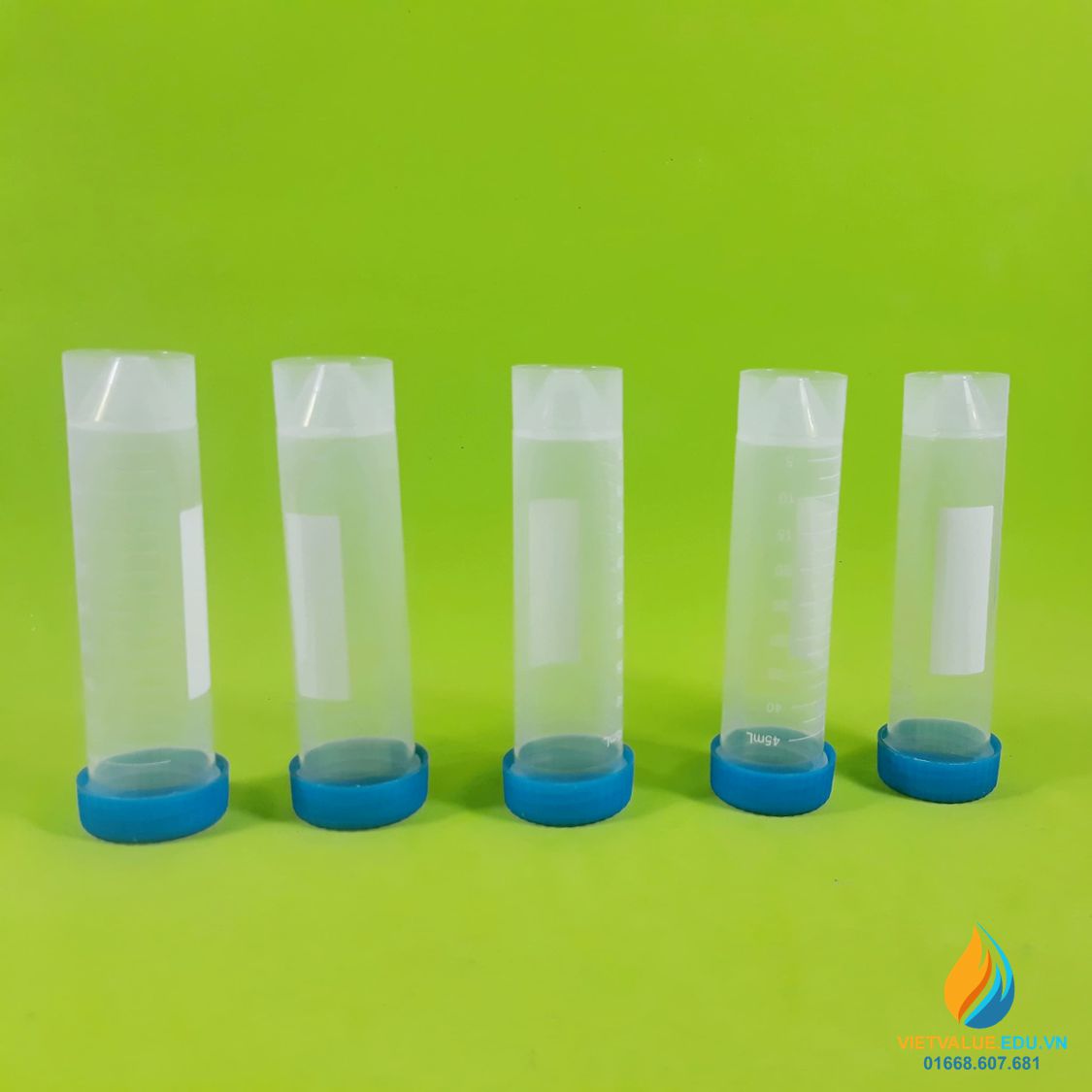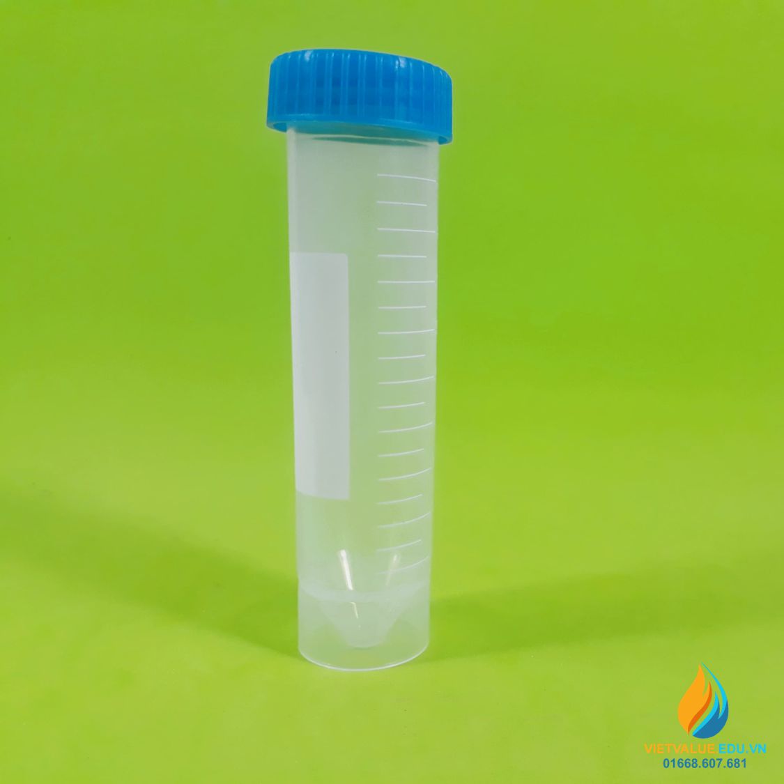 Đáy nhọn, vít phẳng, 50ml, miệng 2cm, lực quay 16000 RPM. Tiệt trùng tia gamma. Chịu nhiệt -80°C - 1210C. Quay ly tâm tách mẫu chất.