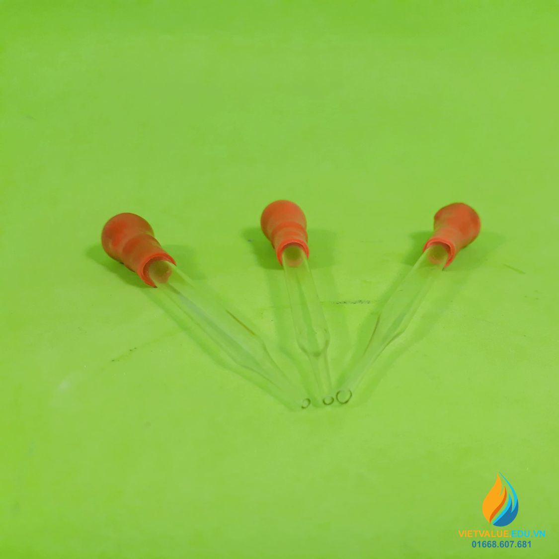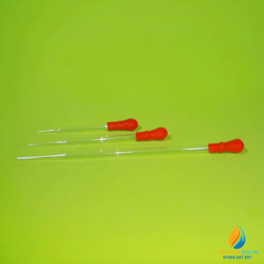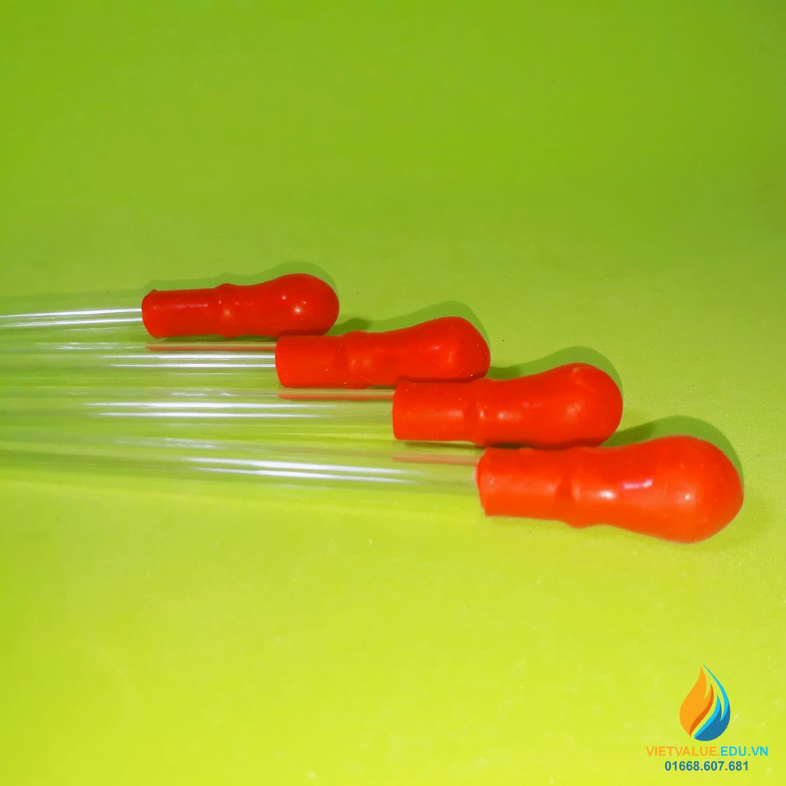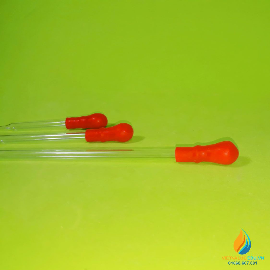 Pipet hút bằng thủy tinh, bầu cao su, dài 9cm, 10cm, 12cm, 15cm, 20cm. Dùng trong các thí nghiệm hóa, lý, sinh học, liên quan đến pha chế, pha trộn dung dịch chất lỏng